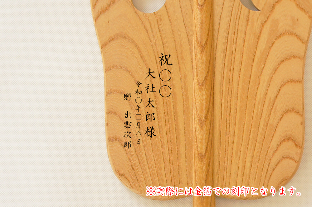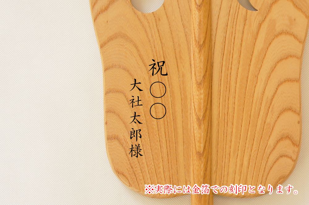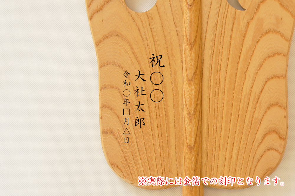 ご注文いただく「招福軍配」の扇の裏側にお名前や日付などを金箔で刻印することができます。